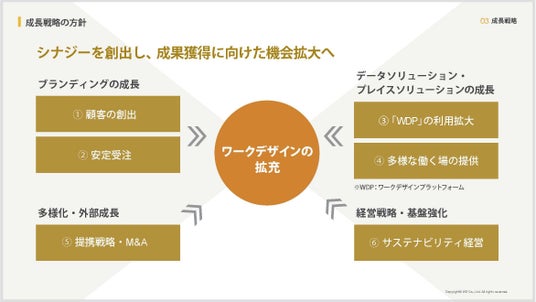 当社は『ワークデザイン』の拡充を目指し、多様なシナジーを創出することで、成果獲得に向けた機会拡大を推進しています。ブランディングの成長、データソリューション・プレイスソリューションの成長、多様化・外部成長、経営戦略・基盤強化の4つの面から、それぞれの戦略を通じて、さらなるシナジーを創出し機会拡大を促進することで、今後も成長を続けてまいります。