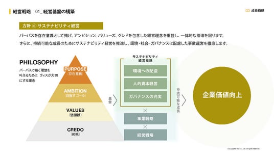 当社は、持続可能な成長と企業価値の向上を実現するため、サステナビリティ経営を経営方針の中核に据えています。企業の存在意義を示すパーパス『はたらく人々を幸せに。』を基盤とし、アンビション(目指すゴール)、バリューズ(価値観)、クレド(行動指針)を包含した経営理念のもと、全社一体となった取り組みを推進しています。また、環境、社会、ガバナンスに配慮した事業運営を徹底し、社会的責任を果たしながら、持続可能な社会の実現に貢献してまいります。