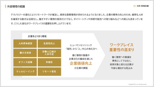 このような背景のもと、ワークプレイスの環境整備は単なる「費用」ではなく「投資」として捉えられており、その重要性は今後さらに高まっていくと考えられます。