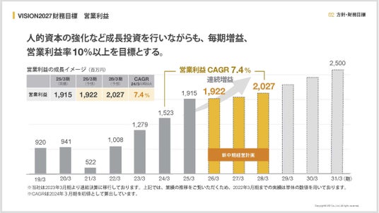 その結果、2026年3月期の財務目標である連結売上高16,169百万円および連結営業利益1,597百万円を1年前倒しで達成いたしました。これを受けて、2026年3月期より3年間(2026年3月期から2028年3月期)を対象とした新中期経営計画を策定することといたしました。