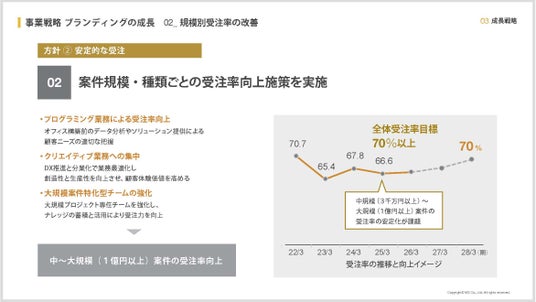 中規模から大規模(1億円以上)の案件の受注率の安定化を課題とし、全体の受注率としては70%以上を目指し、安定的な受注の確保を実現していきます。