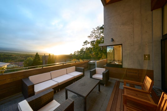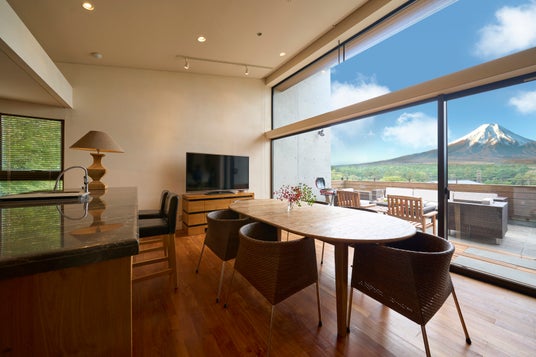 「スイートヴィラ 忍野Mt.FUJI」は、忍野八海で有名な山梨県忍野村の静かなロケーションに佇む、洗練された高級貸別荘で、リビングやバルコニー、浴室から四季折々の美しい自然と富士山の絶景が心ゆくまでご堪能いただけます。室内は4LDKの広々とした空間で、高原のリゾートらしいデザインを取り入れた自然を感じさせる温かみのあるインテリアを配置し、最大7名様までの宿泊が可能。さらにペット同伴の宿泊も可能で、愛犬・愛猫を連れて“家族”揃って自然の中で過ごす休日をお楽しみいただけます。リビングスペースでは、冬季にオプションとして薪ストーブを利用することができ、非日常的な空間を演出します。リビングから繋がるバルコニーは、広大な自然と富士を見晴らす景色を眺めながらのBBQがプライベートで楽しめます。