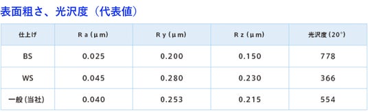 二次電池外装やコネクター用途では、逆に表面を粗した白肌(WS 仕上)を推奨し、接着剤との密着性(二次電池外装)や製品表面のレーザ刻印の視認性(コネクター)を向上する事に貢献しております。