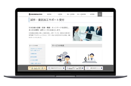 2025年4月1日より当社ホームページをリニューアルし、『試作・委託加工サポート受付』ページを開設しております。当社取り扱い素材や製造範囲に限らず、日本金属のネットワークを通じてお客様の製品開発プロセスの一役を担い、その実現に向けサポートいたしますので、何なりとお申し付けください。