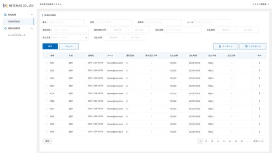 管理画面では決済状況をリアルタイムで確認でき、請求・決済履歴をCSV形式でエクスポートすることも可能です。