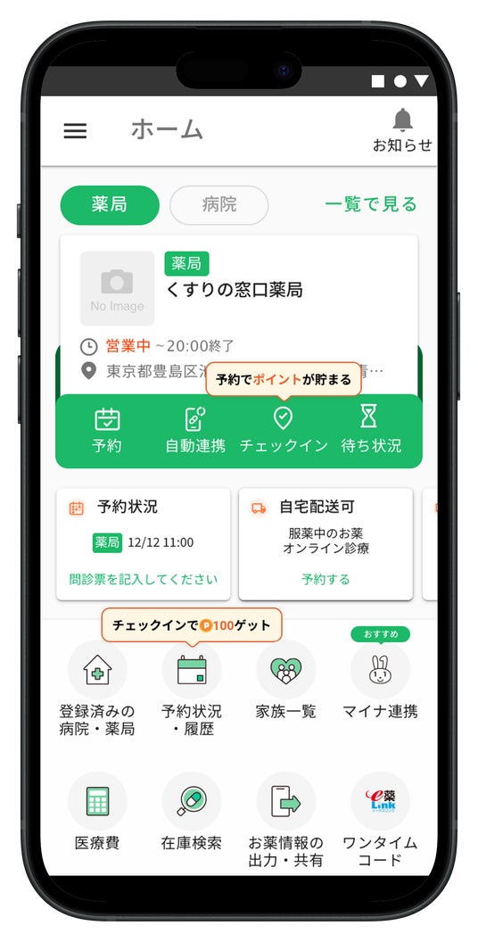 今回、予約機能に合わせて利用いただける、お薬受け取り店舗への到着確認を行う「チェックイン機能」を追加リリースいたしました。