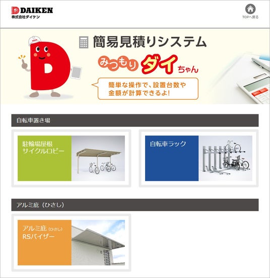 駐輪場設備製品[自転車ラック・駐輪場屋根]やアルミ庇(ひさし)の見積りができるオンライン見積システム「みつもりダイちゃん」