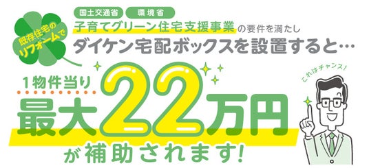 建築金物・外装用建材・エクステリアなどの総合メーカー 株式会社ダイケン(本社:大阪市淀川区 社長:藤岡洋一)は、国土交通省・環境省が実施する『子育てグリーン住宅支援事業(リフォーム カテゴリ)』の補助金 対象製品として、当社の宅配ボックス「TBX-D型、TBX-BD型〈共用・複数ボックスタイプ〉」が認定されたことをお知らせします。ダイケンは『子育てグリーン住宅支援事業』を通して、カーボンニュートラルの実現に貢献していきます。