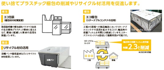 「自社バリューチェーン」のフェーズにおいては、使用期間の短い使い捨てプラスチック梱包のバイオマスへの切り替えや、リターナブルコンテナ活用による製品輸送時の梱包材の削減・再利用、非外観部よりリサイクル材の活用拡大を推進しています。
