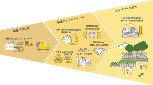 LIXILでは、環境ビジョン2050「Zero Carbon and Circular Living(CO2ゼロと循環型の暮らし)」を掲げ、2050年までに事業プロセスと製品・サービスによるCO2排出量を実質ゼロにすることを目指しています。そして、この環境戦略の実現に向けた3つの重点領域の1つを「資源の循環利用を促進」とし、浴室事業においても、「事業プロセス」「自社バリューチェーン」「インパクトの拡大」の全フェーズを通じた包括的な戦略アプローチおよび中期目標を定めて、取組みを進めています。