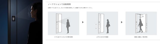 シームレスモデルに、子扉側の機能ユニットに内蔵したディスプレイ型顔認証システムを導入します。ディスプレイで自分の顔が認証できているか否かを確認ができるほか、パスワード入力での施解錠にも対応しています。自動開閉機能と組み合わせることで”玄関ドアに触れず”、”足を止めない”シームレスなエントリー体験を実現します。