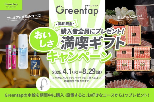 2025年4月1日(火)~8月29日(金)の期間中、「グリーンタップ」をご購入・設置いただくと、プレミアムな家飲み、または極上グルメをお楽しみいただけるギフトをプレゼントします。