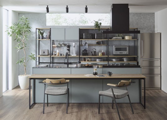 高いデザイン性と機能性を兼ね備え、自分らしく魅力的な暮らしを提供するノクト。プロダクトディティールと空間コーディネートの双方向からのデザインにこだわった、魅せる暮らしを提供するシステムキッチンです。ノイズを抑えた人造大理石のワークトップデザインは空間に主張しないので、従来のキッチンイメージとは異なる家具のような印象を与えます。