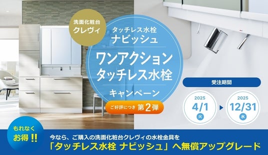 2025年4月1日(火)~12月31日(水)の期間中、洗面化粧台「クレヴィ」をご購入いただくと、水栓金具をタッチレス水栓「ナビッシュ」へ無償アップグレードします。