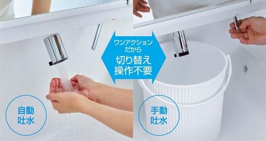 触らずに吐水/止水の操作ができるナビッシュ。自動吐水と手動吐水の切替操作が不要で、目的に合わせて使いやすいタッチレス水栓です。自動吐水では、”手をふれずに差し出すだけ”のワンアクションで水が出てくるので、ハンドルを汚さずに手を洗うことが可能です。また、花瓶の水汲みなど連続で吐水をしたいときや停電時には、”ハンドルを操作するだけ”のワンアクションで手動吐水の操作ができます。