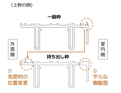 持ち出し枠は、指定の寸法までであれば、奥行き寸法が不足した現場においてふかし枠を使わずに取付けができる部材です。窓枠を活かした意匠提案はもちろん、ふかし枠を手配する必要がなくなり、より短時間で施工ができるようになります。また、クロス巻き込み納まりの現場でクロスの見切材としての効果も発揮します。持ち出し枠の設定はリフォーム内窓「インプラス」の引違い窓の一般枠とアルミレール枠が対象になります。