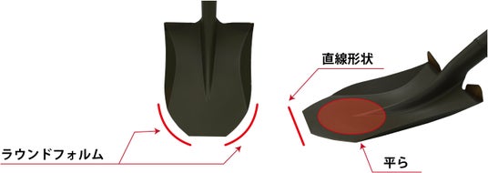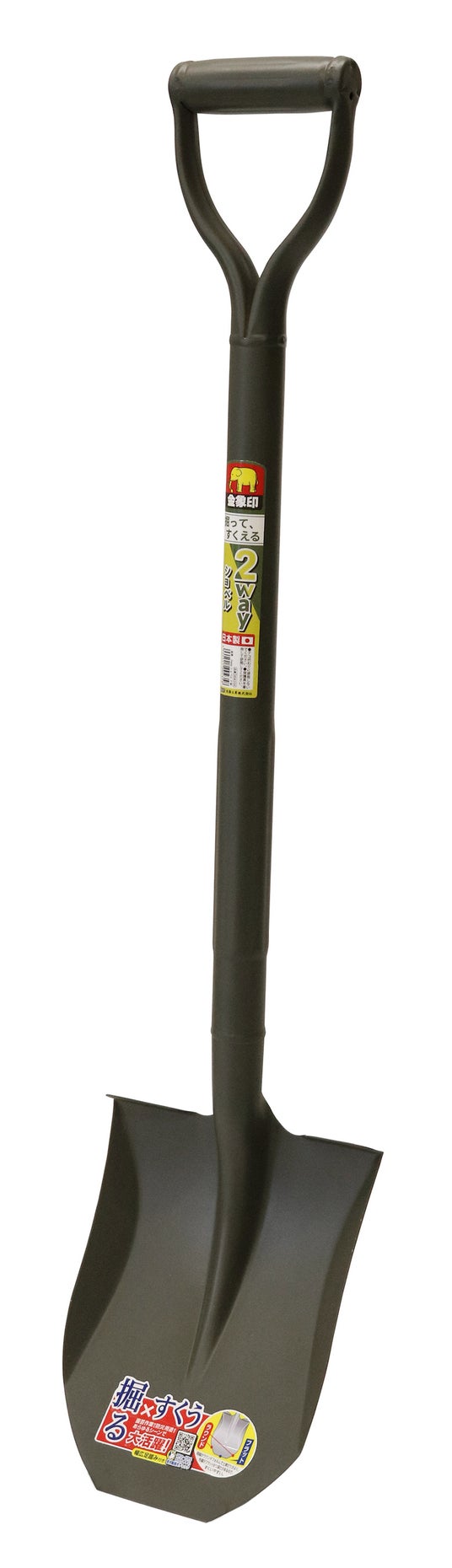 「金象 2wayショベル P柄」は一般的な丸形ショベルと角形ショベルを融合した形で、土刺さりを良くするためにラウンドフォルムにし、すくい作業を効率よく行うためにすくい面を平らに構成した新タイプのショベルです。