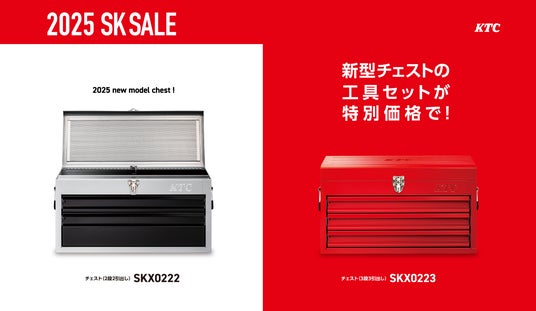 2006年の発売以降、KTCチェストのスタンダードであるSKX0213のデザインと機能を一新した2種類のチェスト(SKX0223シリーズ、SKX0222SBK)を採用した工具セットや、クールで洗練された2025 SK SALEの特別カラーの工具セットなど、新たな整備環境のスタンダードとなる工具セットをその手に。詳細は2025 SK SALEスペシャルサイト(https://sk.ktc.jp)をご覧ください。