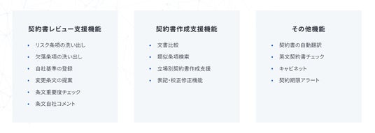 導入社数250万社以上、累計送信件数1,500万件超の国内シェアNo.1の契約マネジメントプラットフォーム「クラウドサイン(R)︎」が提供するAIによる契約書の自動レビュー支援サービスです。2023年7月より株式会社リセと資本業務提携をし、本サービスの提供を開始いたしました。契約書ファイルをアップロードし、自社の立場を選択すると、AIが即座に不利な条項や抜けている条項を指摘します。専門弁護士が作成した解説や自社に有利な条文サンプルも表示されるため、高度な専門知識がなくても、レビューの工数を大幅に削減できます。