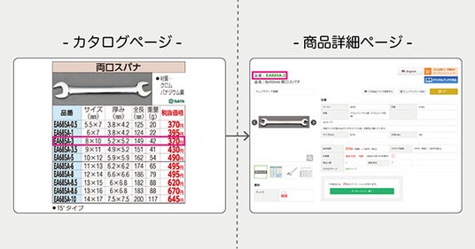 オンラインで閲覧可能な『ESCO便利カタログ(デジタルブック)』では、各品番をクリックするだけで該当品番の商品詳細ページに直接アクセスすることができます。これにより、多数掲載しているMRO商材から関心のある商品をスムースに確認でき利便性向上に繋がります。