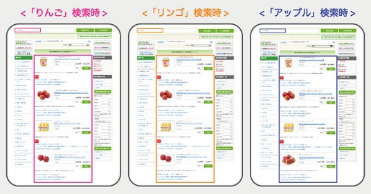例:「リンゴ」「りんご」「リンコ゛」「アップル」など、異なる表記でも同じ検索結果が表示される