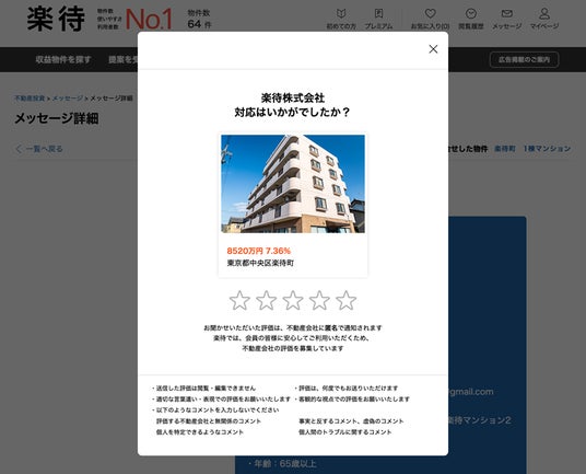 不動産投資家は、楽待サイト上で収益物件に問い合わせて案内を受けた後、不動産会社の接客や商談内容について評価を行います。評価は自動集計されてレポートになり、不動産会社側で閲覧することができます。レポートでは5点満点の総合評価と「対応スピード」「接客態度」「情報の正確性」「不動産投資の知識」「コンプライアンス意識」「物件の調査能力や提案力」の項目別評価、自由入力の意見を確認することができます。2021年11月から提供をはじめ、不動産投資家から寄せられた不動産会社の評価数は累計で20万件以上にのぼります。