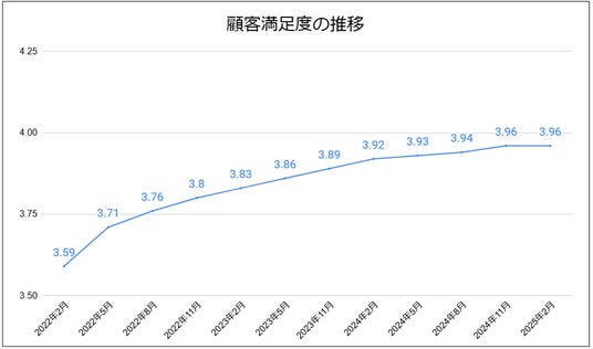 改善活動を始めてから3年経ち、平均の顧客満足度が向上