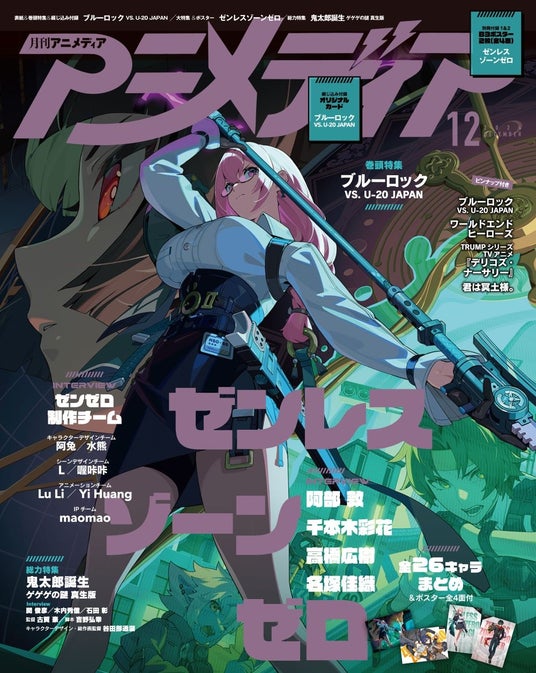 アニメディア12月号は『ゼンレスゾーンゼロ』のポスター全4面や、『ブルーロック VS. U-20 JAPAN』の綴じ込みフォト&フォトグレイカード付き。