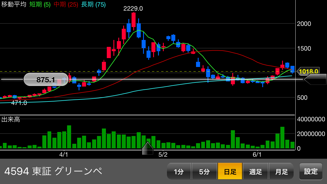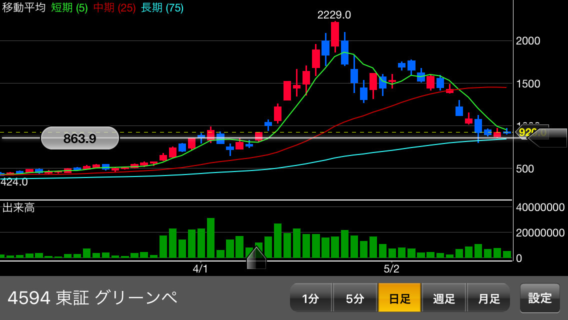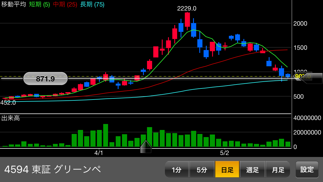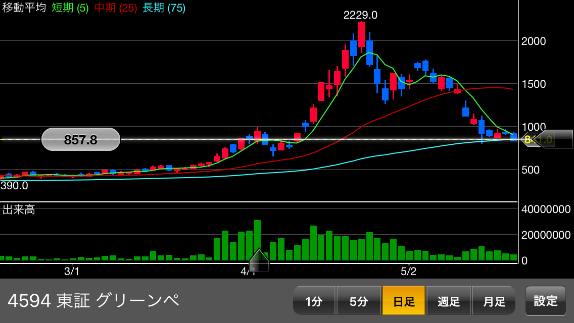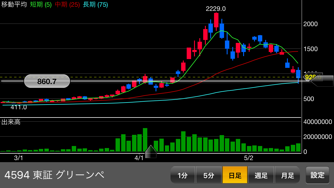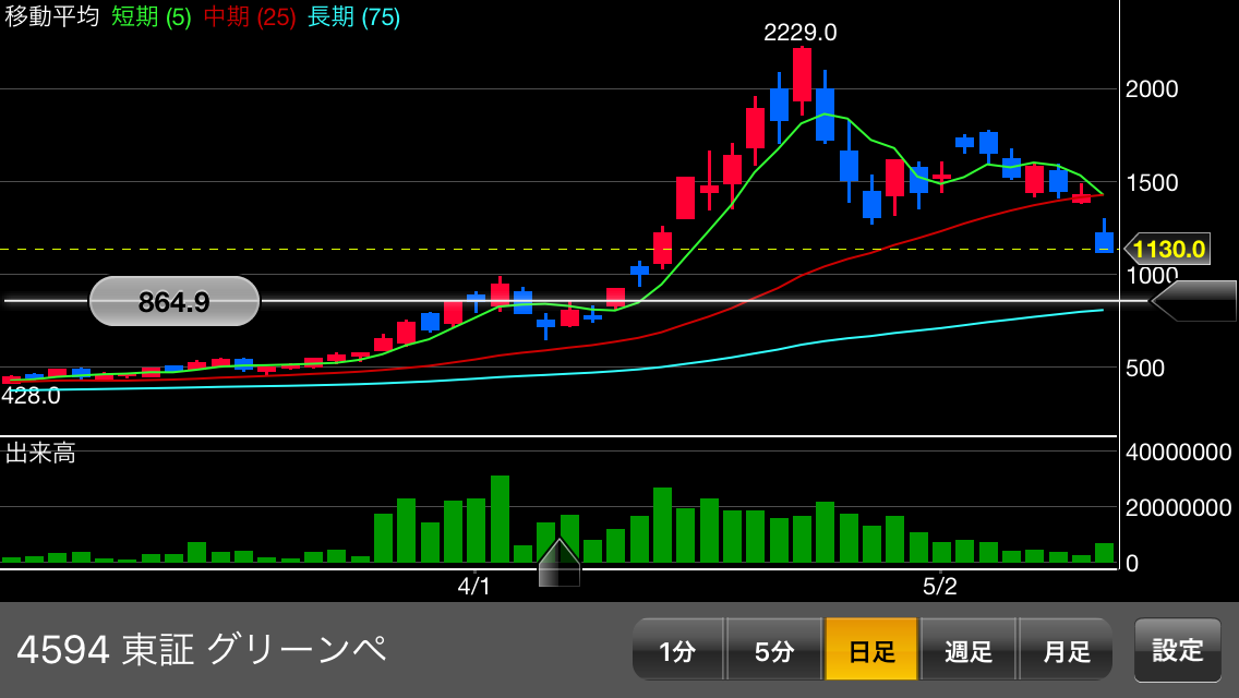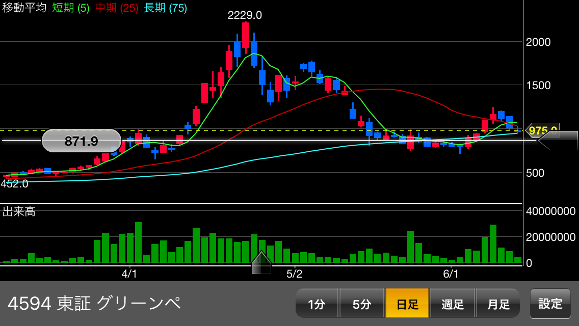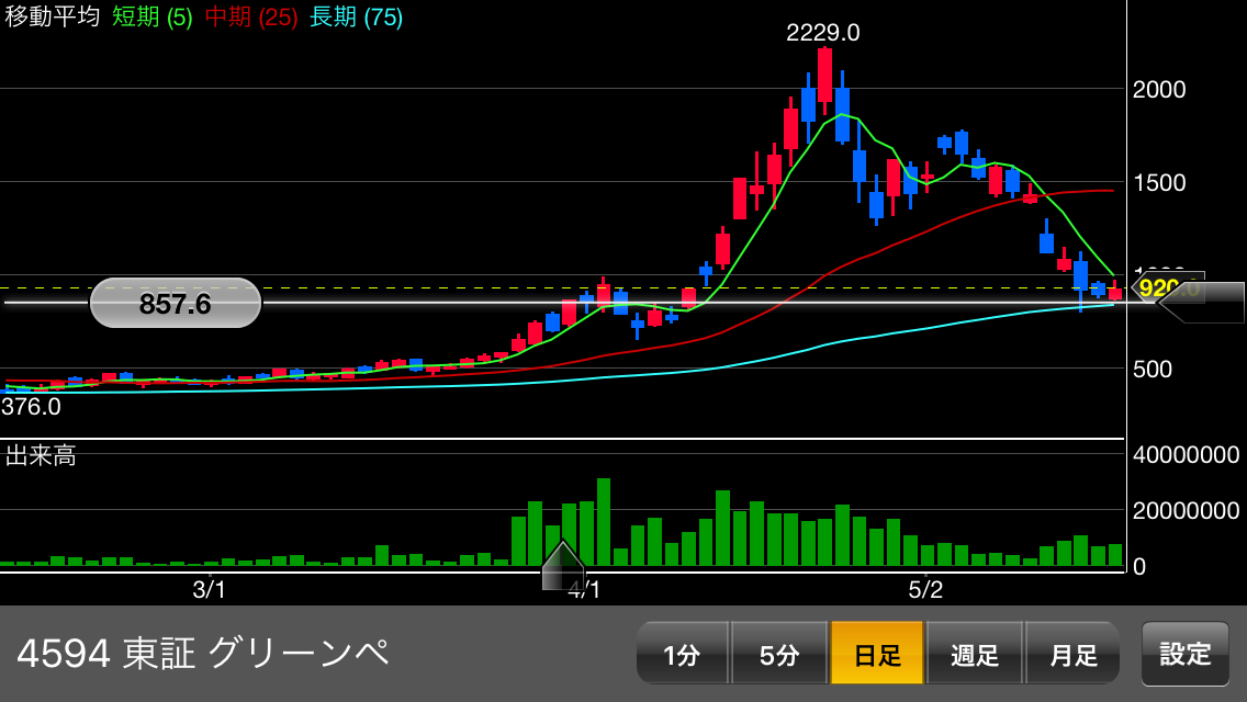 今日は先週金曜日に買ったアライドアーキテクツの100株を握りしめたまま静観の一日でした☆ ★4594 グリーンペプタイド(がん治療・バイオ関連)目先1,300円方向へ突っ込むと今回の上昇相場は一端終了の可能性。 5/16株価1,13... ...続きを読む
