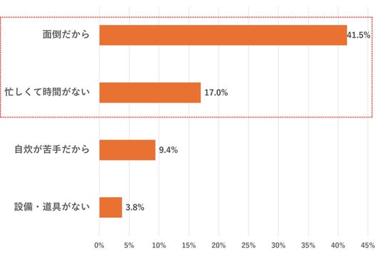 自炊の頻度を月「0回」と答えた53名にその理由を聞いたところ、1位は、「面倒だから」(41.5%)でした。次いで、「忙しくて時間がない」(17.0%)という結果でした。
