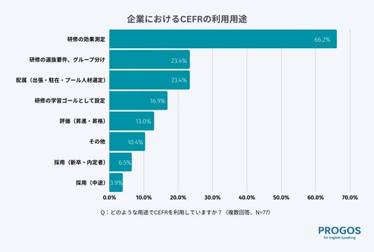 「研修の効果測定」としての利用が全体の約7割と最も多く、研修の設計や進捗の可視化、学習効果の測定にCEFRが役立っていることが分かります。