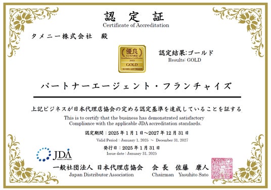 タメニー株式会社(本社:東京都品川区、代表取締役社長:栗沢研丞、証券コード:東証グロース6181)が運営する結婚相談所「パートナーエージェント」のフランチャイズ展開は、この度、一般社団法人日本代理店協会が行う「優良ビジネス認定2025」においてゴールド認定を受賞いたしましたので、お知らせいたします。