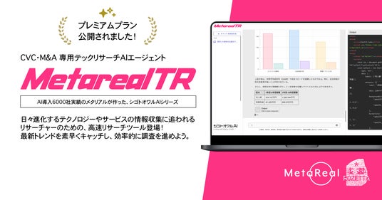 業種特化の専門AI開発・運営を行う株式会社メタリアル(本社:東京都千代田区、代表取締役:五石順一)は、協業先発掘や出資検討業務を支援するサービスとして、CVC・M&A領域専用AI「Metarealテクノロジーリサーチ(以下、Metareal TR)」が月額50,000円(税込)(20回/日、200回/月)で利用できるプレミアムプランを6月16日(月)より開始しました。