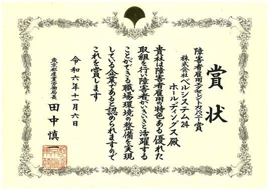 株式会社ベルシステム24ホールディングス(本社:東京都港区、代表取締役 社長執行役員CEO:梶原 浩、以下:当社)は、東京都が主催する「令和6年度障害者雇用エクセレントカンパニー賞(産業労働局長賞)」を受賞しました。