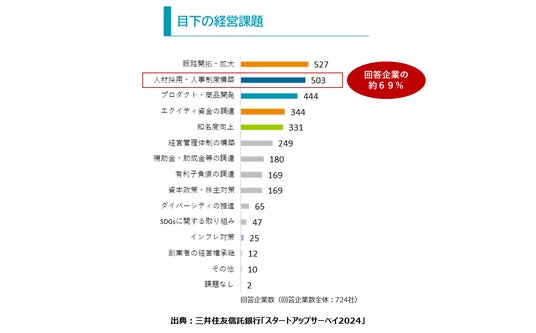 近年、スタートアップを取り巻くマーケットは成長を続けており、政府も「スタートアップ育成5か年計画」を打ち出すなど、官民問わず大きな注目が集まっています。しかし、スタートアップ企業は、少人数で多岐にわたる業務を遂行する必要があり、多才な人材が求められる一方で、大企業に比べて知名度が低いことから優秀な人材の確保が難しい現状にあります。三井住友信託銀行が行った「スタートアップサーベイ2024」においても、目下の経営課題のひとつに「人材採用・人事制度構築」を挙げる企業が約69%を占めるなどの結果が出ています。