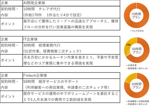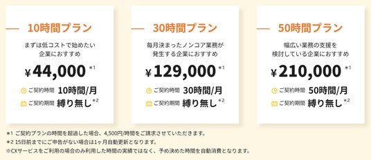 本サービスの料金プランは、委託する業務に必要な時間数に応じて3つのプランを用意しています。ご要望に応じて、プラン以外の実働時間でのカスタマイズも可能です。