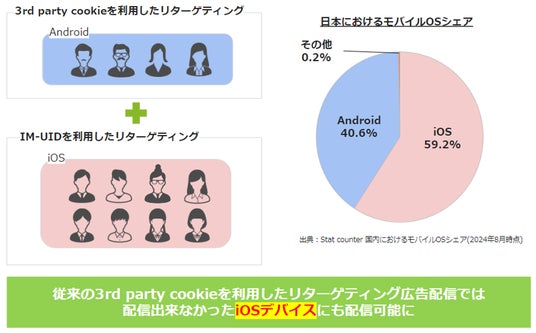 共通IDソリューション「IM-UID」とは、インティメート・マージャーが提供する3rd Party Cookieを用いずにユーザー識別を可能とするソリューションで、「Logicad」においてもリターゲティング・オーディエンスターゲティング広告配信に導入しており、3rd Party Cookieが利用規制されているiOSデバイスに対しても、ユーザーのプライバシーを保護しながら広告配信が可能となります。