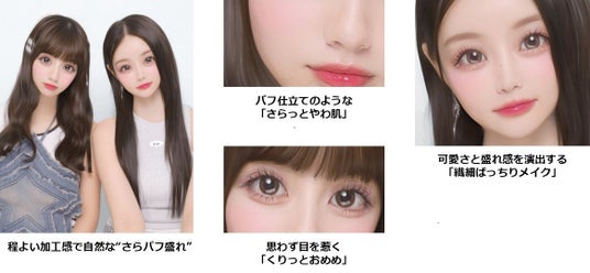 また、パーツバランスはやりすぎない程よい加工感で、みんなが自然に盛れるように。ふんわり広がるピンクのチークや程よいツヤ感のリップは、やわらかい肌の質感にマッチし、盛れ感と可愛さを引き