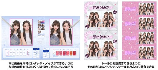 自分の気に入ったレタッチを、1枚ずつに全てを施す作業はどうしても時間がかかってしまいます。そんな苦労を、ワンタッチで解決できる新機能が「メイクりれき」です。レタッチやメイクの選択履歴を保存して、ワンタッチで1枚ずつ反映できるので、大幅な時間短縮に繋がります。さらに、落書き画面で同じ画像を同時にレタッチ・メイクができる「左右同時プリ画選択」も搭載。この機能があれば友達の操作を待つ必要がなくなり、落書き時間をもっと楽しめるように。