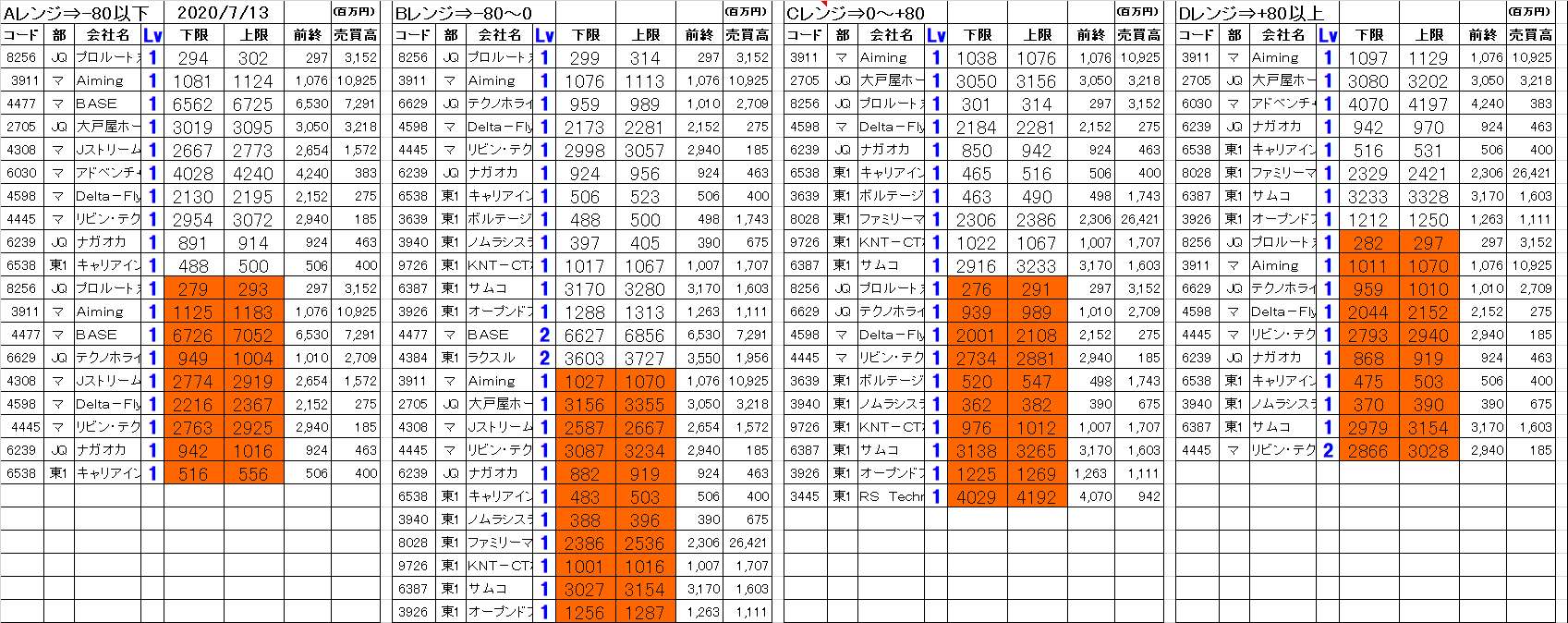 2020/7/13(月曜日) 今日のシステムトレードの仕掛候補一覧です。今日の日経の寄り付きはDレンジでした仕掛表の各レンジは日経平均の前日終値比で以下のよ... ...続きを読む