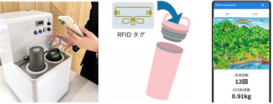 実験内容は、象印マホービン株式会社の「マイボトル洗浄機」をサトー本社のカフェに設置して、マイボトルを繰り返し使える環境を整備。マイボトルには個人IDをひも付けたRFIDシールを貼り、マイボトル洗浄機の利用履歴を洗浄作業の動作と一体化した読み取りで自動的に記録し、専用アプリでプラカップ削減数およびCO2削減量を可視化します。アプリを通じてユーザに行動効果を示すことで、意識の変化と継続利用を促すものです。