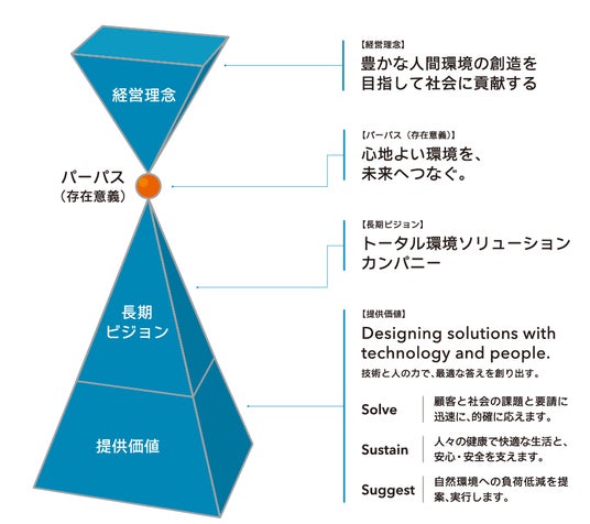 当社が一貫して提供してきた「人々の健康」、「快適かつ安心安全な暮らし」、そして「自然との共存」を「心地よい環境」という一語に集約しました。また、「心地よい環境」を保ち、明日へと引き継いでいくことを示すため「未来へつなぐ」と表現しています。