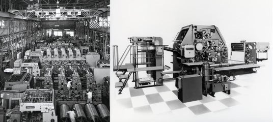 左:初めて国立印刷局に納入した銀行券印刷機は足立工場で製造右:1958年に国立印刷局に納入された凸版枚葉2色印刷機TR231