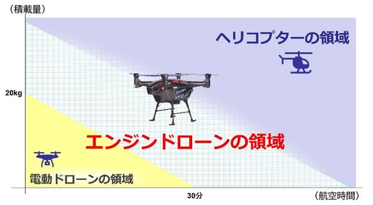現在、物流やインフラ管理、防災対策の一部でドローンが活用されていますが、飛行の安定性や航空時間、重量物輸送が課題となっています。エンジンドローンは、これらの課題を解消するとともに、需要が高まっている無人化・省人化にも寄与するニューモビリティとして、その活用が期待されています。