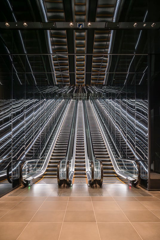 エスカレータには足元を照らして安全性と意匠性の向上を同時に叶える「スカードガードLED照明」を装備。このLED照明の光がエスカレータを囲む天井と左右の壁面に反射するとともに、壁面に埋め込まれた照明のライティングモーションとエレクトロニックミュージックが連動し、没入感のあるインスタレーションとなっています。