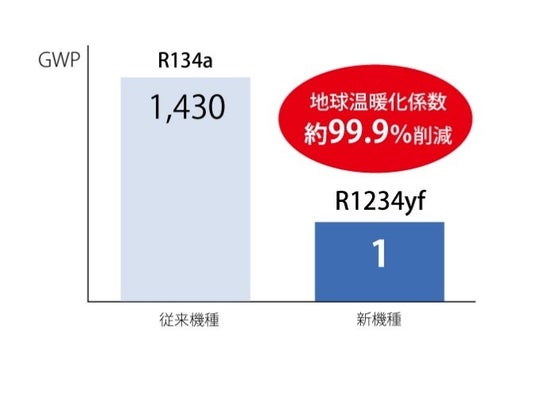 従来機種のR134a(GWP:1430)と比べ地球温暖化係数(GWP)が著しく低く、地球環境に優しい製品です。フロン排出抑制法の対象外となり、点検や記録の保管などの管理義務が発生しません。