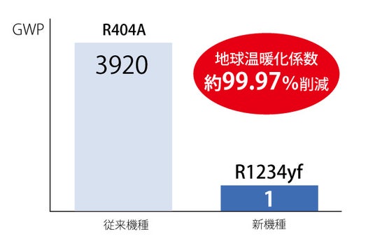 従来機種のR404A(GWP:3,920)と比べ地球温暖化係数(GWP)が著しく低く、地球環境に優しい製品です。フロン排出抑制法の対象外となり、点検や記録の保管などの管理義務が発生しません。
