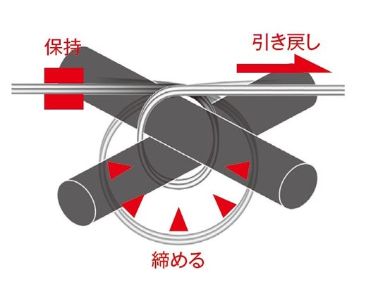 結束時にワイヤが輪をつくり引き戻すことで、鉄筋をしっかりと引き寄せ、緩みやすい壁や柱での鉄筋結束作業もスムーズに行えます。また、引き寄せることで鉄筋径に合わせたワイヤ量となり、ワイヤのムダを減らします。