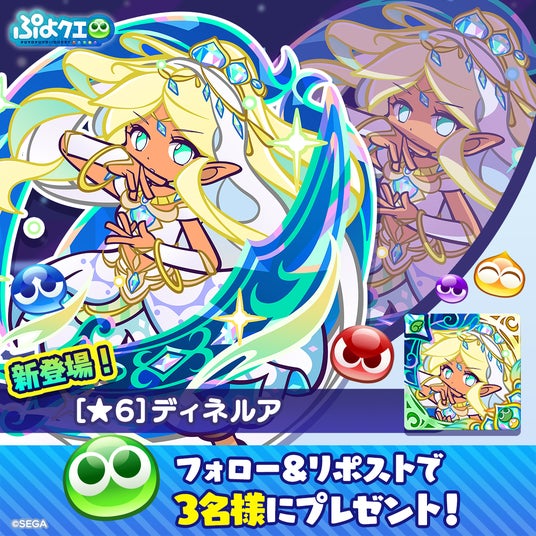 内容:『ぷよぷよ!!クエスト(ぷよクエ)』公式Xアカウントと公式Instagramアカウントにて、キャンペーンに参加した方の中から抽選で、「[★6] ディネルア」をプレゼントするキャンペーンを開催します。