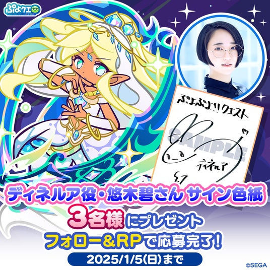 『ぷよぷよ!!クエスト(ぷよクエ)』公式Xアカウントにて、キャンペーンに参加した方の中から抽選で、“「ディネルア」役・悠木碧さんサイン色紙”を合計3名様にプレゼントするキャンペーンを開催中です。ぜひご参加ください。